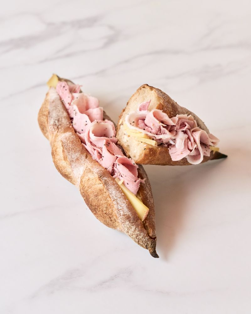 바게트, 잠봉햄 슬라이스, 꼼떼치즈, 블랙페퍼, 씨겨자 드레싱